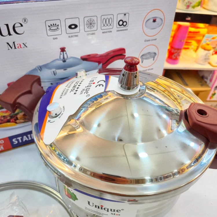 زودپز سه کاره برند مکسی ظرفیت5لیتر جنس استیل کیفیت بسیار بالا استیل 18/10 کف چدن سه سوپاپه استاندارد دارای سبد بخارپز، درب پیرکس آرامپز و زودپز و دارای واشر زاپاس